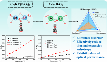 无机材料的理性结构设计在材料科学中仍是一项重大挑战,尤其对深紫外(DUV)非线性光学(NLO)晶体而言。本文通过Cs2KY(B3O6)2(CKYBO)的阳离子调控,成功预测并合成了一种新型DUV透明非线性光学硼酸盐——CsSrB3O6(CSBO)。通过第一性原理声子振动计算确认了CSBO的结构稳定性,并最终通过高温固相反应法成功合成。用Sr2+阳离子取代K+/Y3+阳离子消除了结构无序,并显著降低了热膨胀各向异性(CKYBO:9.32,CSBO:1.95),从而有效防止晶体在生长过程中开裂。此外,CSBO成功实现了B3O6官能团的有序化设计,这一结构特点使其展现出均衡的功能性能,包括强的二次谐波产生响应(5.0 × KH₂PO₄)、短的紫外吸收边(<190 nm)和适中的双折射率(0.075@1064 nm)。所有这些性能表明,CSBO是一种具有前景的DUV非线性光学材料,本研究也为通过计算与实验协同的策略开发高性能NLO晶体建立了有效方法。